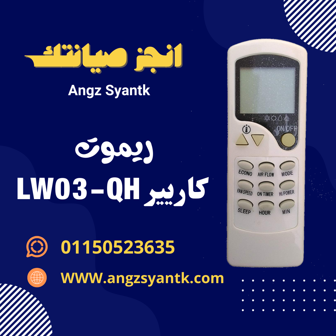 ريموت كارير LW03-QH هو جهاز تحكم مخصص لتكييفات Carrier LW03-QH، يتميز بتصميمه العملي وسهولة الاستخدام. يحتوي على شاشة رقمية تُظهر درجة الحرارة والإعدادات بوضوح، ويوفر تحكمًا كاملاً في وظائف التكييف، بما في ذلك: